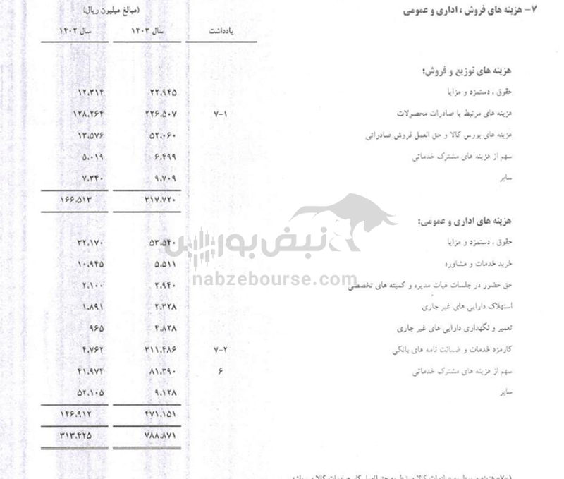 با وجود رشد بالای سود ناخالص، هزینههای فروش، عمومی و اداری ۱۵۲% افزایش داشت و ۷۹ میلیارد تومان گزارش شد. عمده افزایش این قلم هزینهای با کارمزد خدمات و ضمانت نامههای بانکی در ارتباط است؛ که گویا به مبلغ ضمانت نامههای سررسید شده خریدمواد معدنی از شرکت تهیه و تولید مواد معدنی ایران توسط بانک تجارت مربوط است.